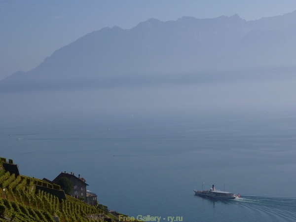 Description:    Панорама Виноградников Лаво на фоне Женевского озера со старинным пароходом