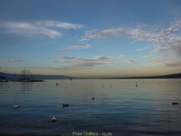 Description:    Вид на Женевское озеро, с отражением неба и облаков, тихим ясным вечером от Бань Паки, октябрь