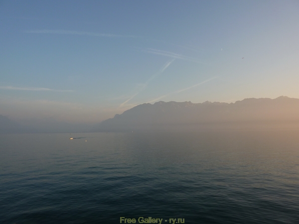 Description:    Альпы и Женевское озеро в светлой дымке, снимок из виноградников Лаво