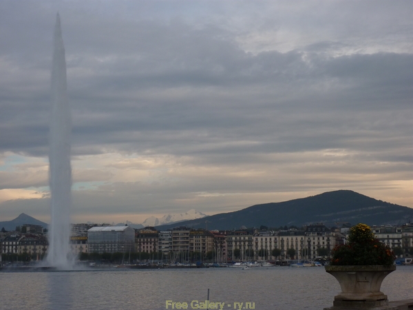 Description:    Женева: озеро, фонтан, Салев и даже немного Монблан - пасмурно, но очень чистый воздух. Середина октября.