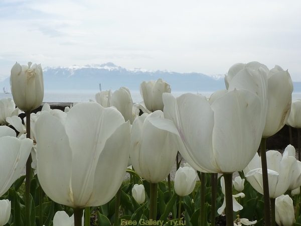 Description:    Белые тюльпаны на фоне Женевского озера и Альп, Фестиваль тюльпанов в г. Морж. Апрель