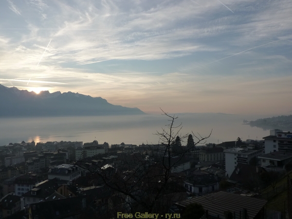 Description:    Январский вид на Монтрё и подернутое дымкой Женевске озеро в свете закатного солнца