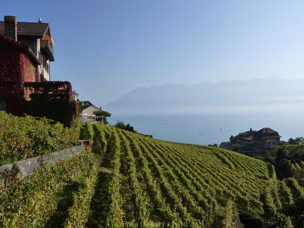 Description:    Панорама Виноградников Лаво на фоне Женевского озера в белой дымке