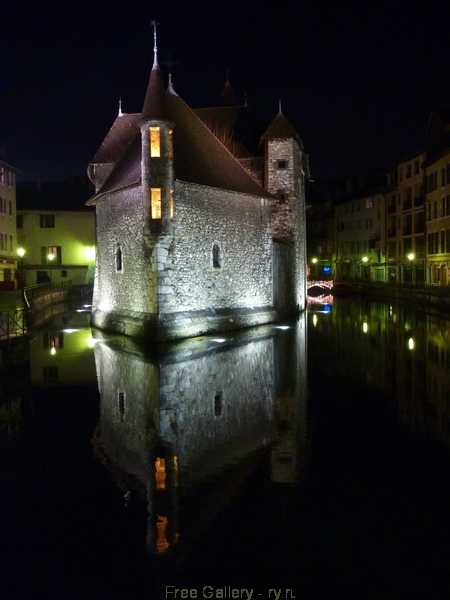 Description:    Ночной вид на средневековый "Островной дворец", расположенный на острове на реке Тиу в исторической части города Анси.