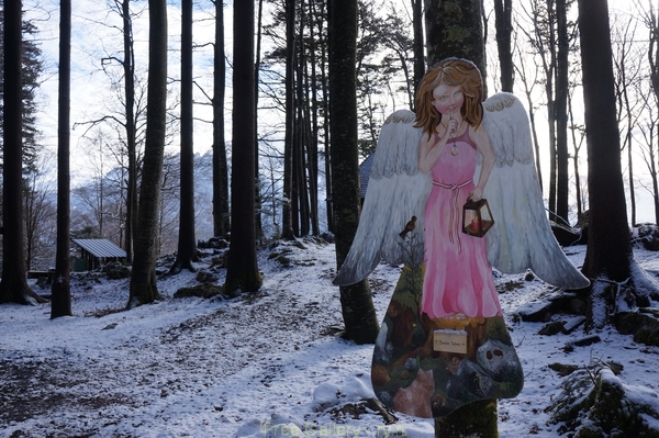 Зелисберг: ангелы - символ городка, часто встречаются при прогулках по прилегающему к нему лесу Таннвальд. Солнечный зимний день в кантоне Ури, Швейцария