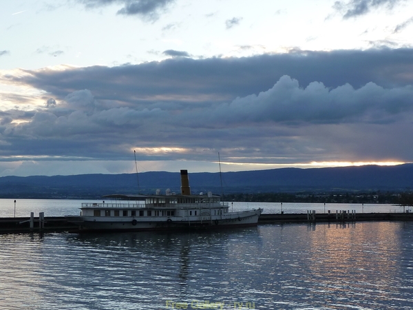 Description:    Вид с набережной Лозанны на Женевское озеро, облака, пароход, в вечернем свете. Май.